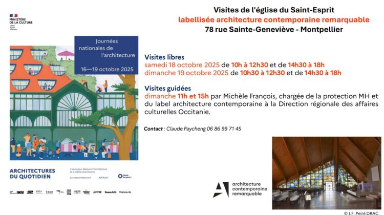 L’église Saint Esprit à Montpellier sera ouverte les samedis et dimanche 18 et 19 octobre 2025 (Journées de l’Architecture) des visites guidées auront lieu le dimanche. Venez découvrir ou mieux connaître cette église sur laquelle a été déposée le 26 septembre dernier, en présence de Monseigneur TURINI, la plaque la labélisant « Architecture contemporaine remarquable » du Ministère de la Culture.