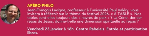 Dans le cadre du 28ème Festival Chrétien du Cinéma, Jean-François Lavigne, professeur à l’université Paul Valéry, vous invitera à réfléchir sur le thème du festival 2026, « À TABLE ». Nos tables sont-elles toujours des « havres de paix » ? La Cène, dernier repas de Jésus, donne-t-elle une dimension spirituelle au repas ?