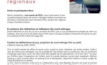Entrée et participation libres.Notre compétition, «Les courts du FCC», vous invite autour d’une nouvelle programmation de courts- métrages réalisés et produits en Occitanie, en partenariat avec Occitanie Films, secteur de L’Agence Unique, Occitanie