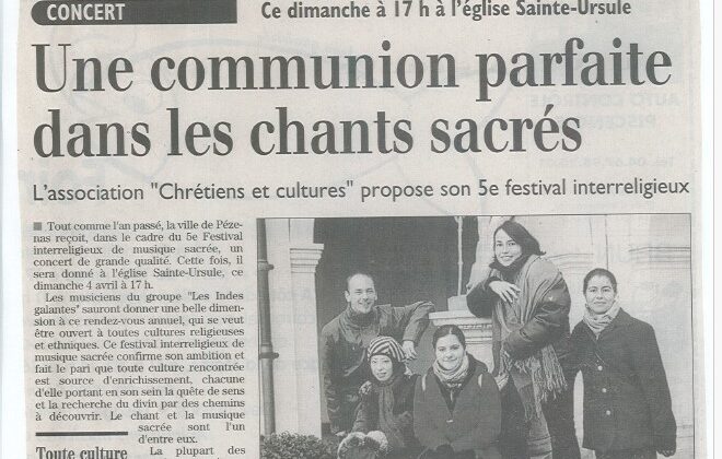 Revenons sur notre « Festival Interreligieux de Musiques Sacrées » et sa 5ème édition, en 2004. Le quatrième groupe fut « Les Indes Galantes » avec deux concerts au Couvent des Dominicains – Montpellier et en l’Eglise