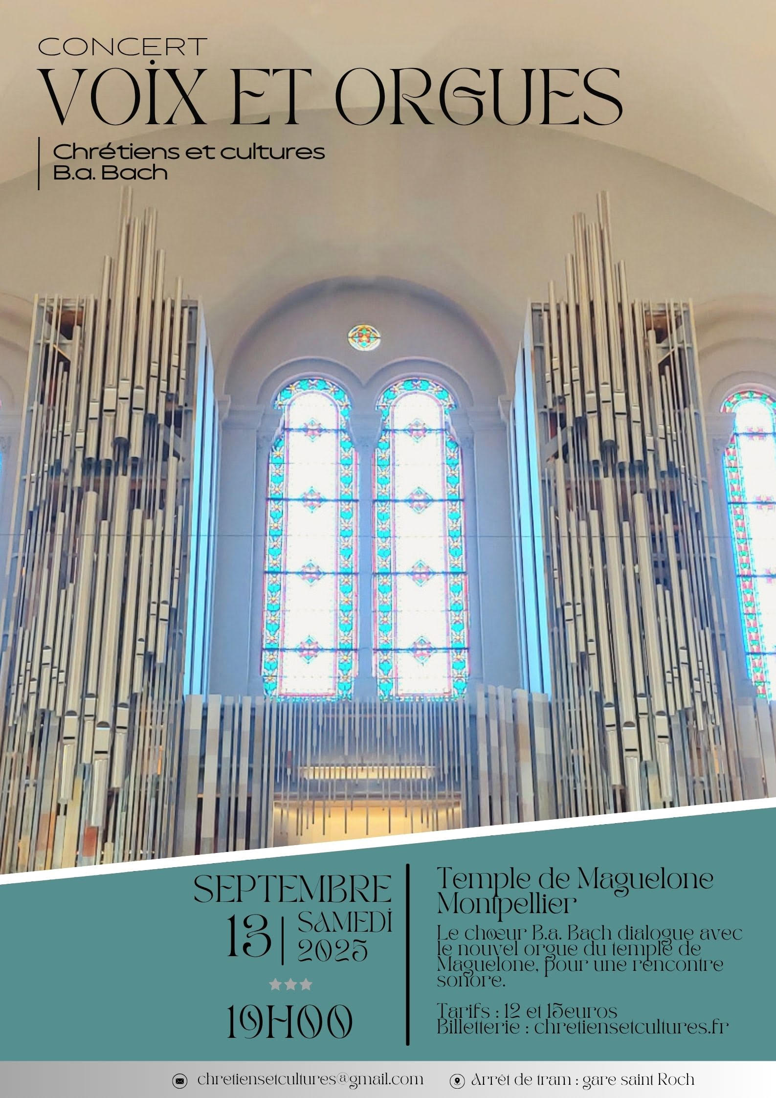 C’est demain ! Concert : Voix et Orgues le Samedi 13 Septembre 2025 au Temple, rue Maguelone de Montpellier. Le Chœur B.a. Bach dialogue avec le nouvel orgue du Temple de Maguelone pour