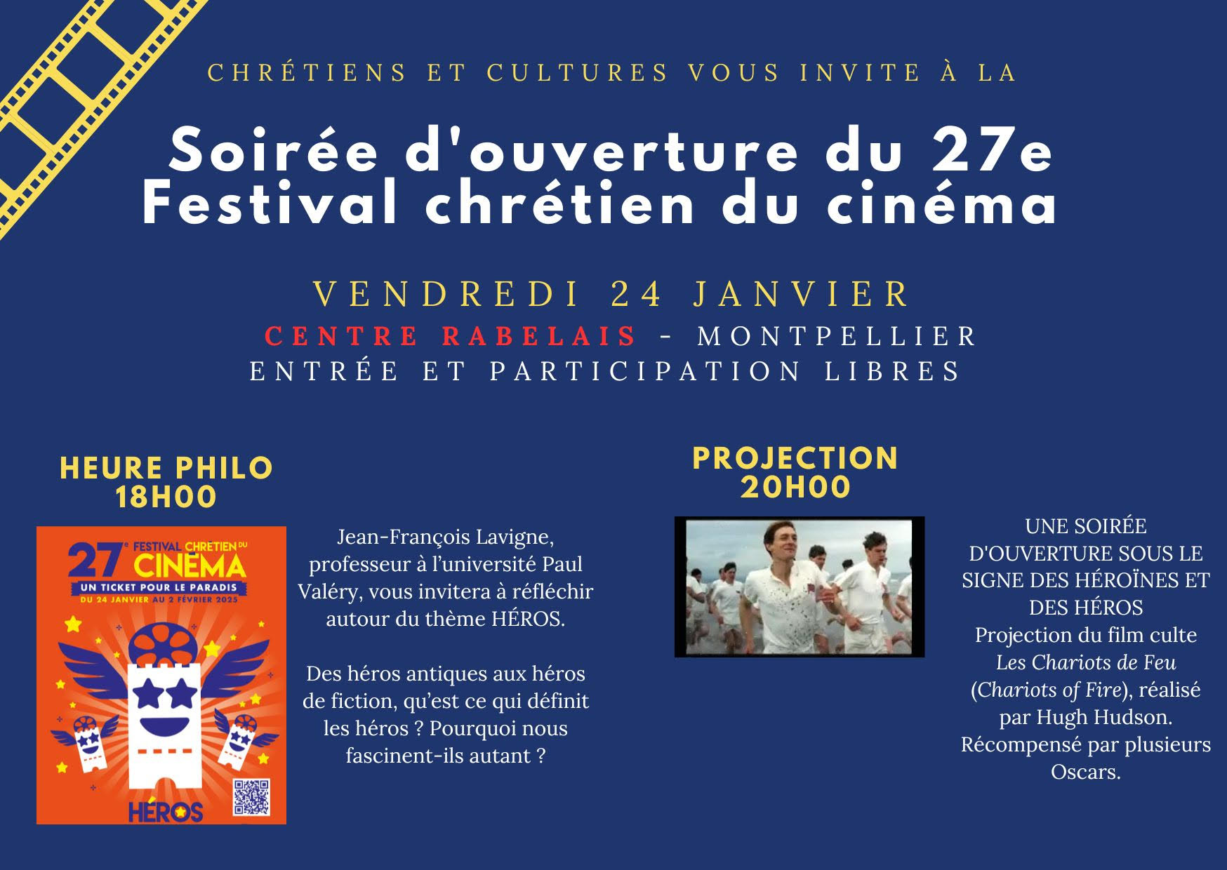 Par ici le programme du 27ème Festival Chrétien du Cinéma ! Aujourd’hui, Jeudi 30 Janvier 2025 au Carrousel, entrée 9 cours Gambetta de Montpellier : – 16h : Atelier découverte : Héros et