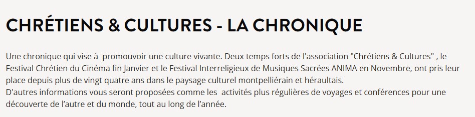 Cette semaine dans notre Chronique radio sur RCF Maguelone Hérault : Philippe Cabrol nous présente le Festival Chrétien du Cinéma et l’évènement au Gazette Café Le FCC sur le thème « Héros » approche à