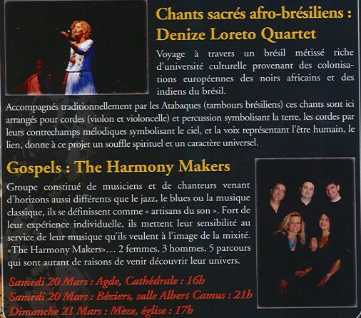 Revenons sur le 11ème « Festival Interreligieux de Musiques Sacrées » qui s’est tenu en 2010. Le premier concert était composé de deux groupes : – Denize Loreto Quartet : Chants sacrés afro-brésiliens – The