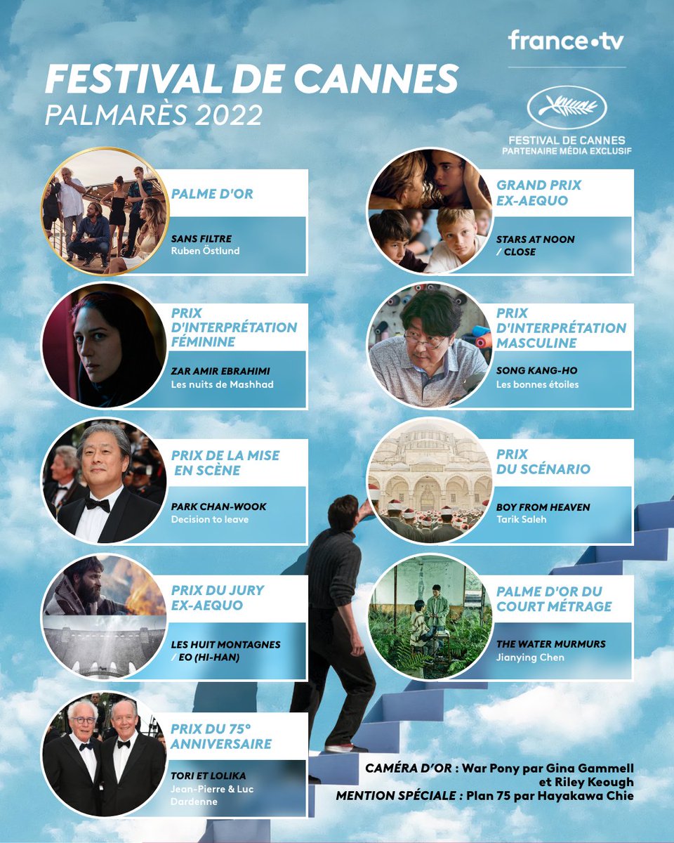 Palmarès officiel du Festival de Cannes 2022 : Compétition : Palme d’or : Sans filtre (Triangle of Sadness) de Ruben Östlund, Suède Grand prix (ex-æquo) : Close de Lukas Dhont, Belgique Des étoiles