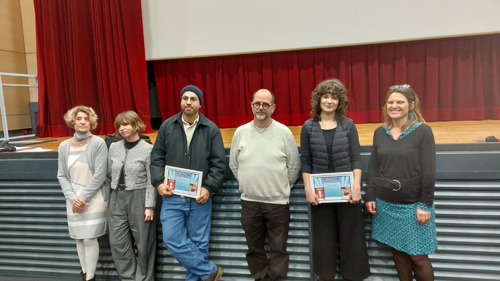 De gauche à droite sur la photo : Clotilde Verriès, Jury ; Méline Slimia, Jury ; Elon Cattan, Prix du public ; Jean-Luc Gadreau, Jury ; Emma Séméria, Prix du Jury ; Monique Cunnac de l’équipe du FCC et animatrice des deux séances.